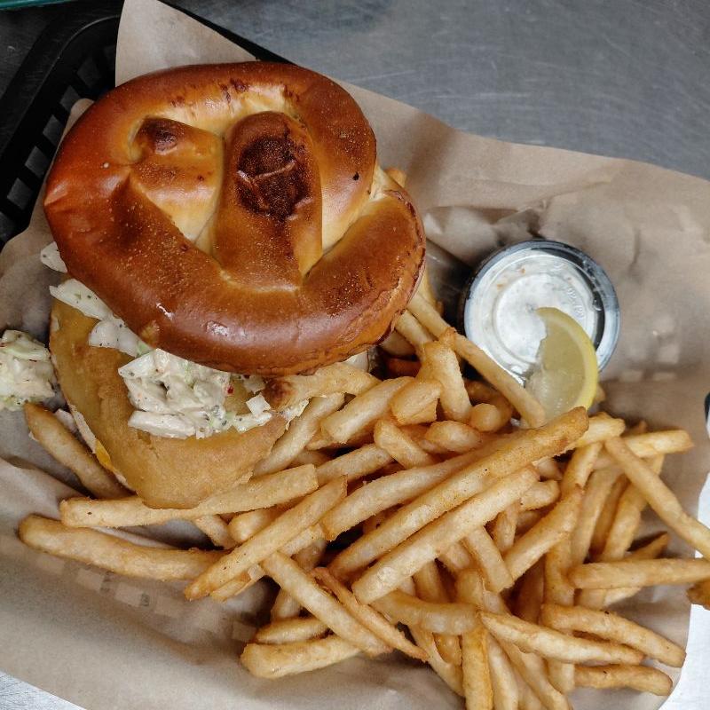 Beer-Battered Cod, Swiss Cheese, Spicy Coleslaw, Pretzel Roll, Fries* | Substitute Side Salad for Fries +$3.00 | sub onion rings $2 | sub loaded or Shepherd's fry +$6 | Sub Soup $5