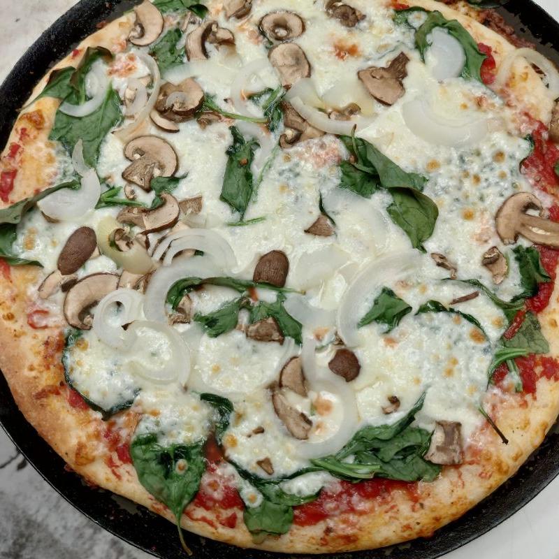 Tomato-based, onion, mushrooms, cooked spinach